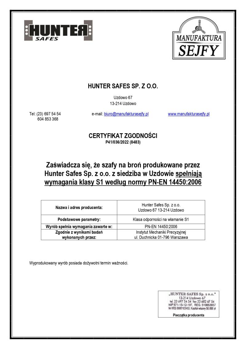 Szafa na broń musi spełniać wymagania klasy S1 PN-EN 14450. Jest to norma ogólnoeuropejska.